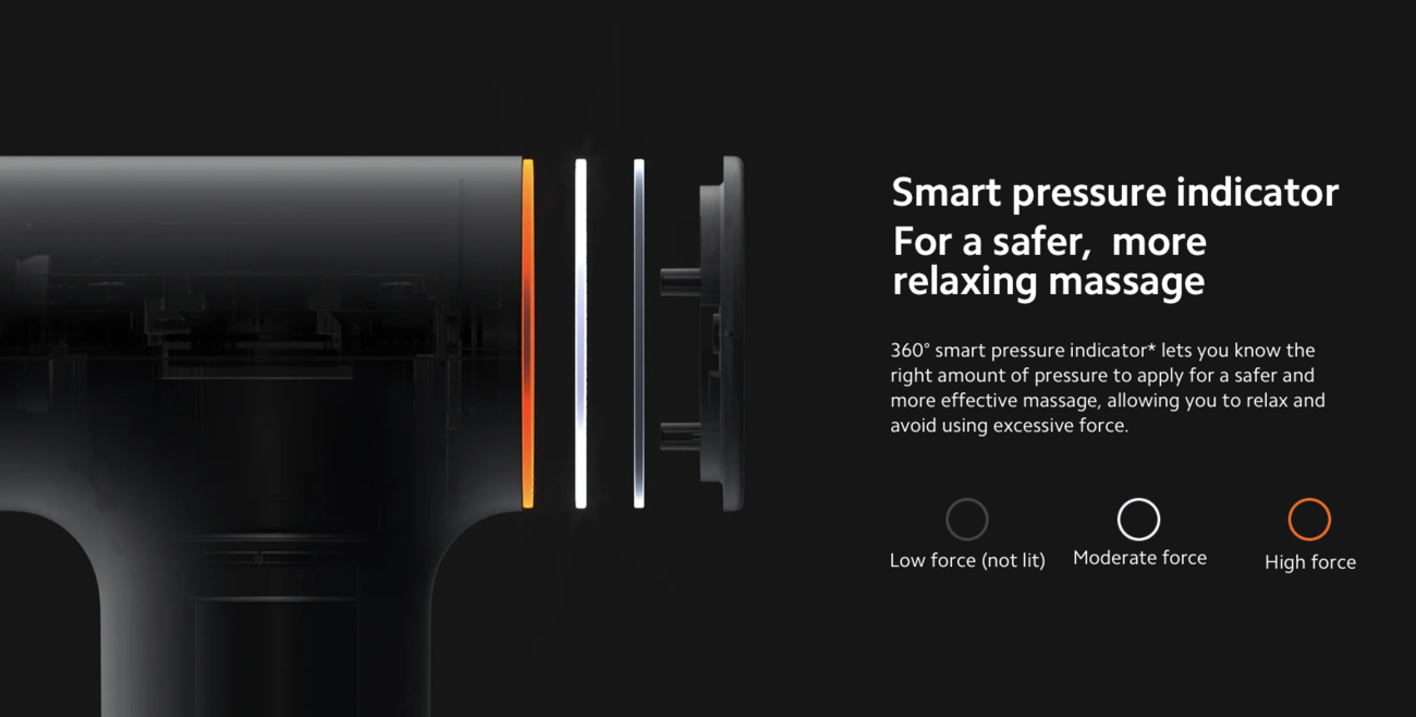 360° smart pressure indicator lets you know the right amount of pressure to apply for a safer and more effective massage, allowing you to relax and avoid using excessive force.