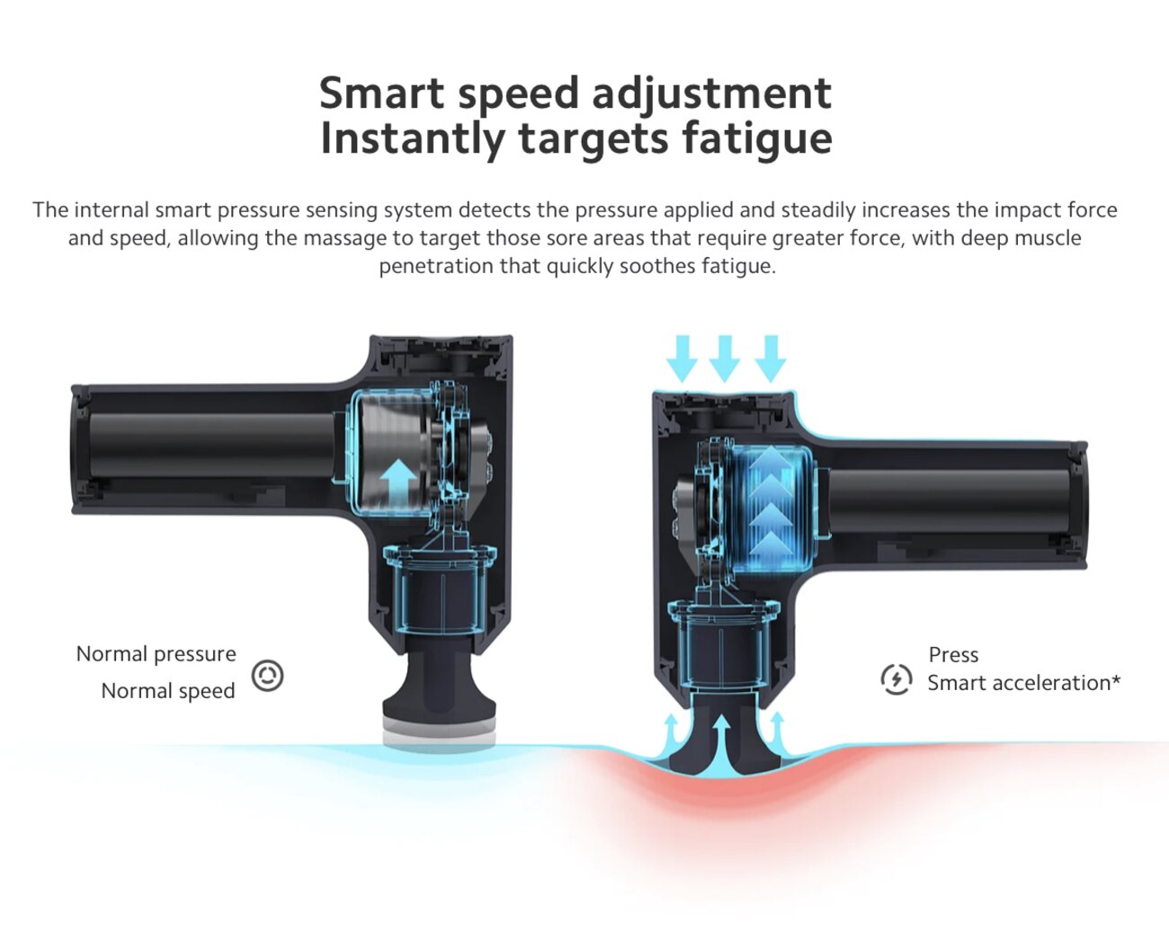 The internal smart pressure sensing system detects the pressure applied and steadily increases the impact force and speed, allowing the massage to target those sore areas that require greater force, with deep muscle penetration that quickly soothes fatigue.
