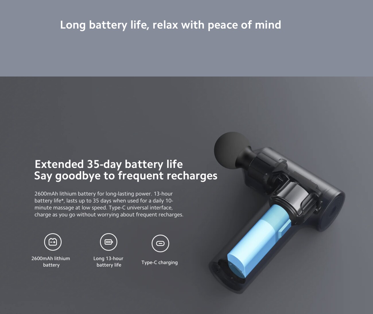 Extended 35-day battery life, 2600mAh lithium battery for long-lasting power. 13-hour battery life*, lasts up to 35 days when used for a daily 10-minute massage at low speed. Type-C universal interface, charge as you go without worrying about frequent recharges.