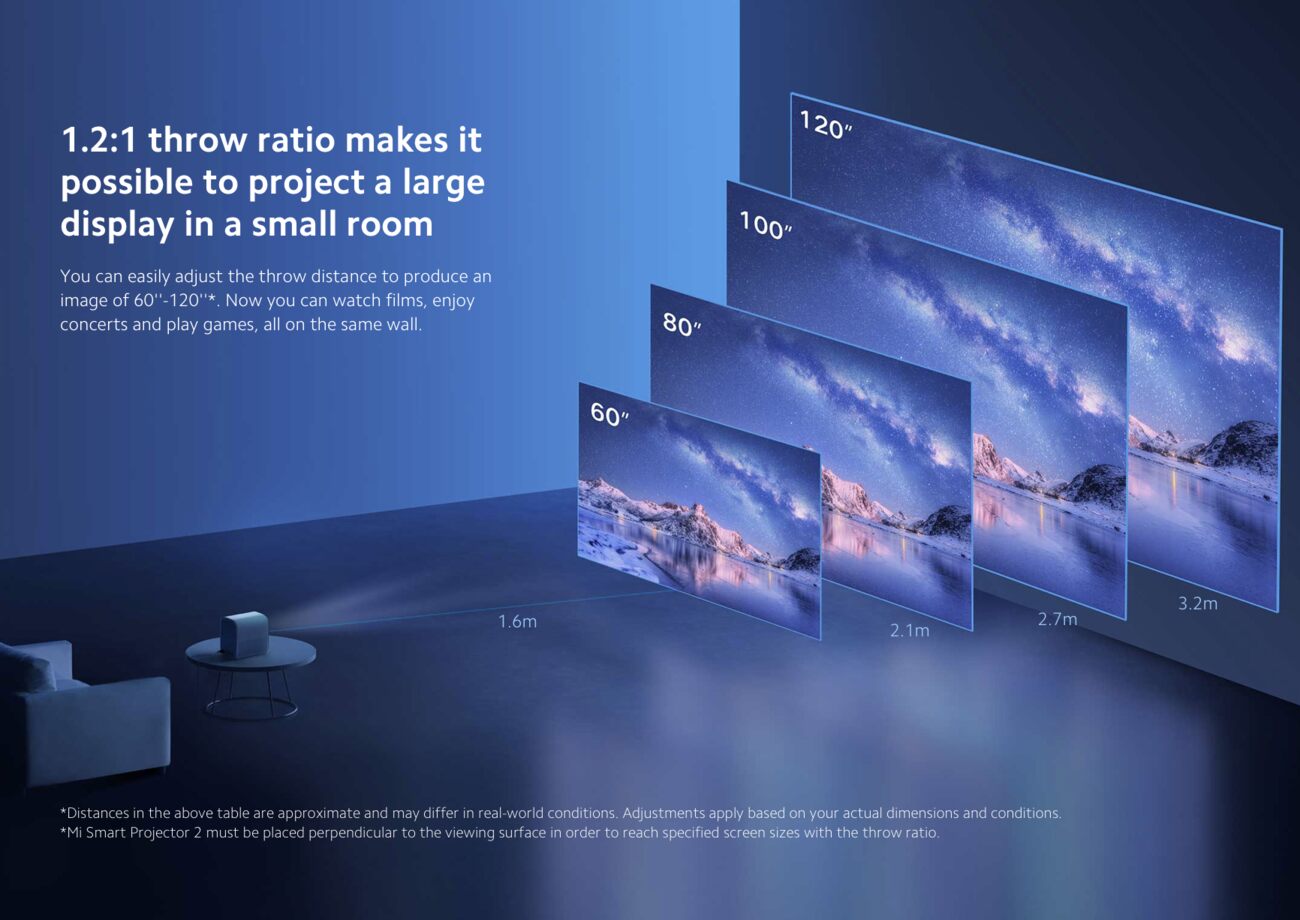 Up to 120'' screen with 1.2:1 throw ratio / 1.2:1 throw ratio makes it possible to project a large display in a small room. You can easily adjust the throw distance to produce an image of 60''-120''*. Now you can watch films, enjoy concerts and play games, all on the same wall.