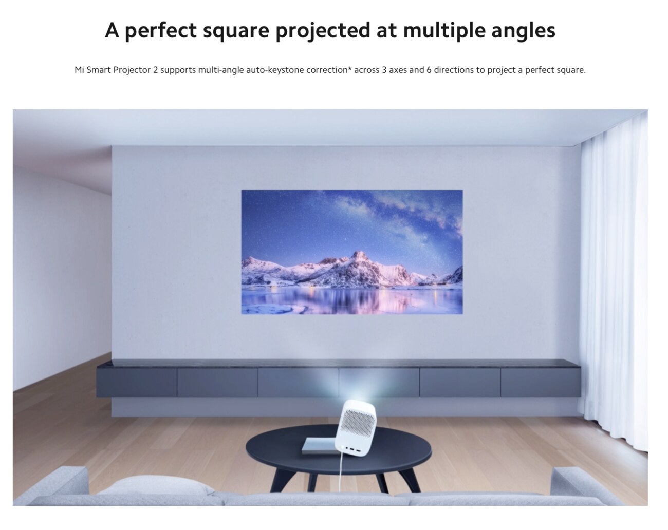 Multi-angle auto-keystone correction / Mi Smart Projector 2 supports multi-angle auto-keystone correction* across 3 axes and 6 directions to project a perfect square. With one HDMI 2.0 port, one USB 2.0 port and one headphone port, the projector supports 4K input and works with hard drives, game consoles, microphones and more, making it perfect for your entertainment needs.