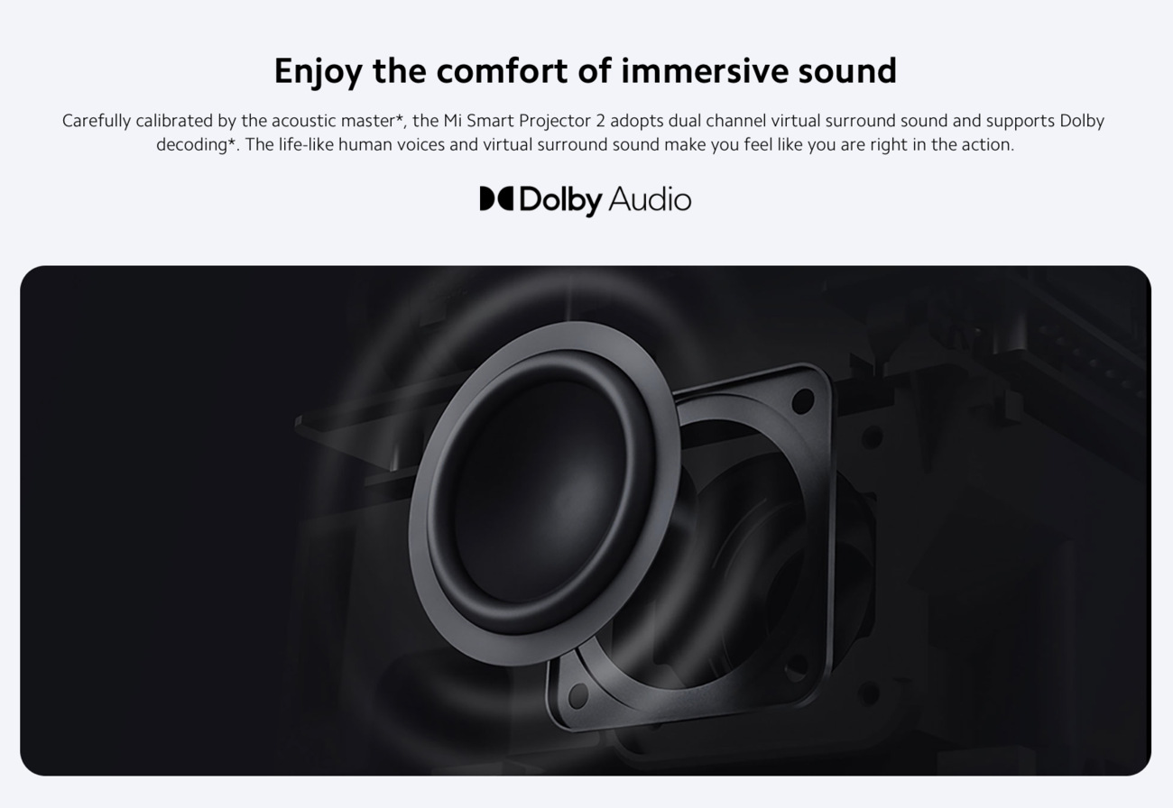 Entertainment with Dolby Audio / Enjoy the comfort of immersive sound. Carefully calibrated by the acoustic master*, the Mi Smart Projector 2 adopts dual channel virtual surround sound and supports Dolby decoding*. The life-like human voices and virtual surround sound make you feel like you are right in the action. Smart hub of an IoT-enabled home.