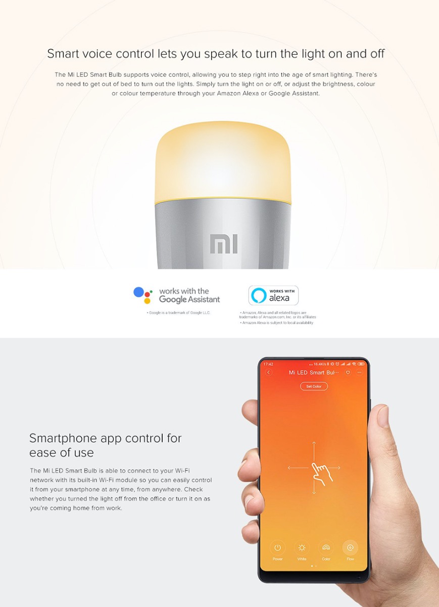 Mi LED Smart Bulb supports voice control with Amazon Alexa and Google Assistant. Turn on the lights .. switch colors .. adjust the brightness and color temperature or turn on Smart Environment with just a few words.