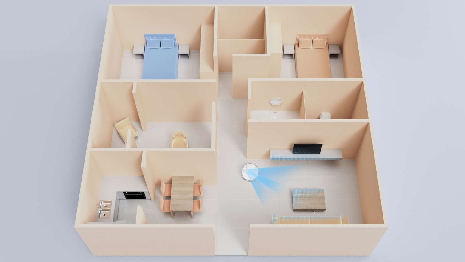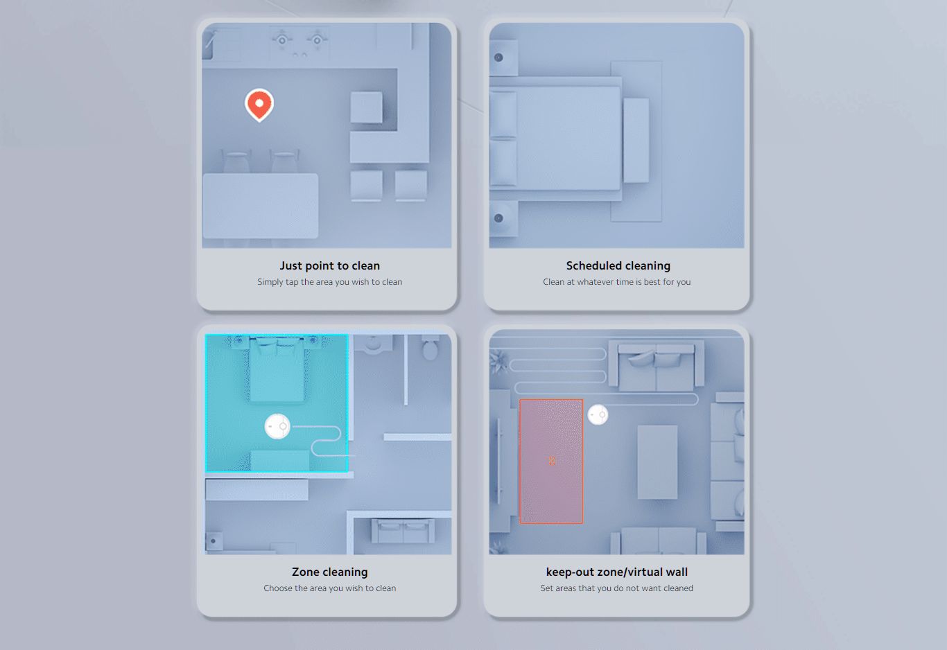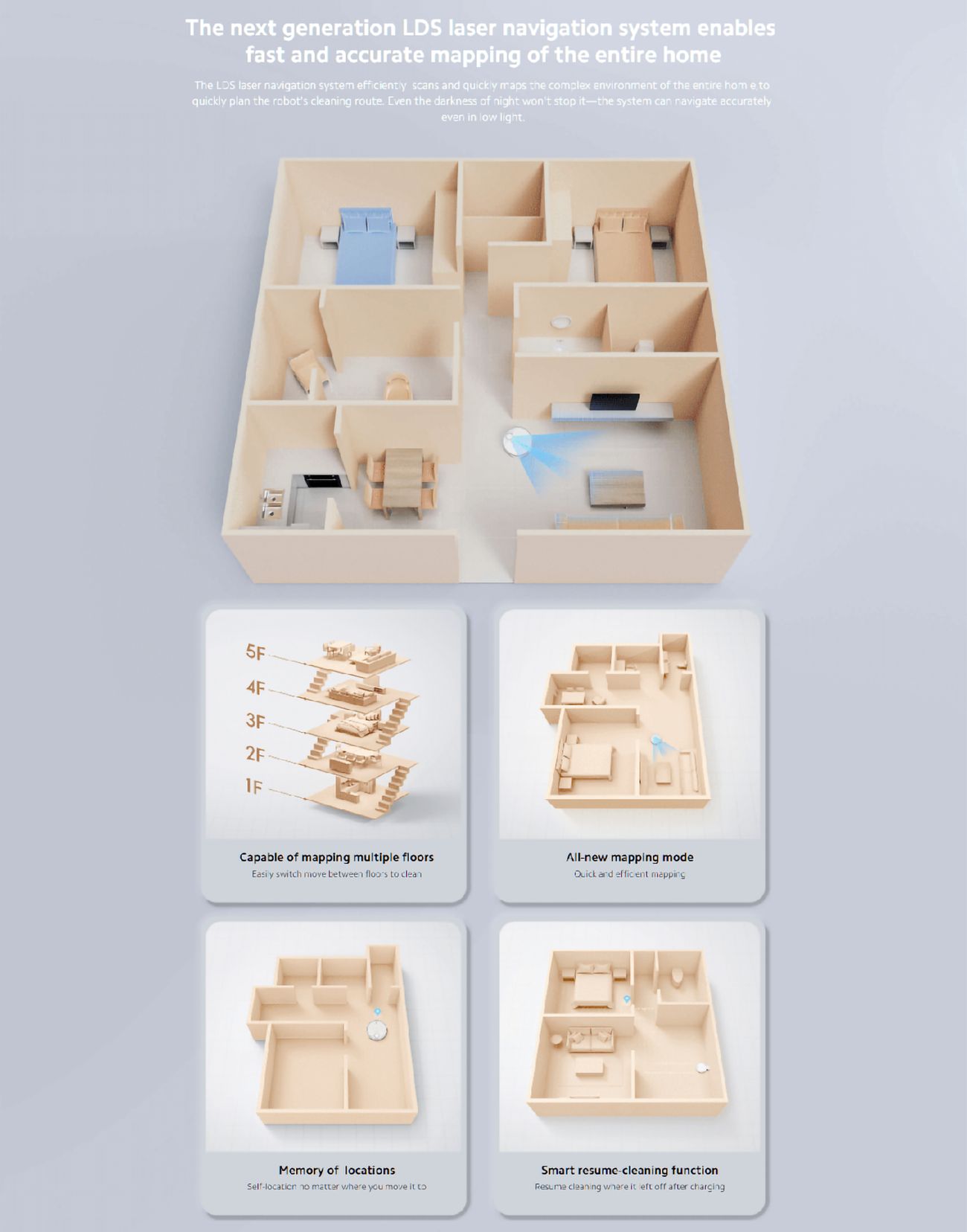 المكنسة فيها ذكاء اصطناعي يخليها تتجنب العوائق وتتذكر مكانها عشان تكون أكثر دقة في كل مرة.